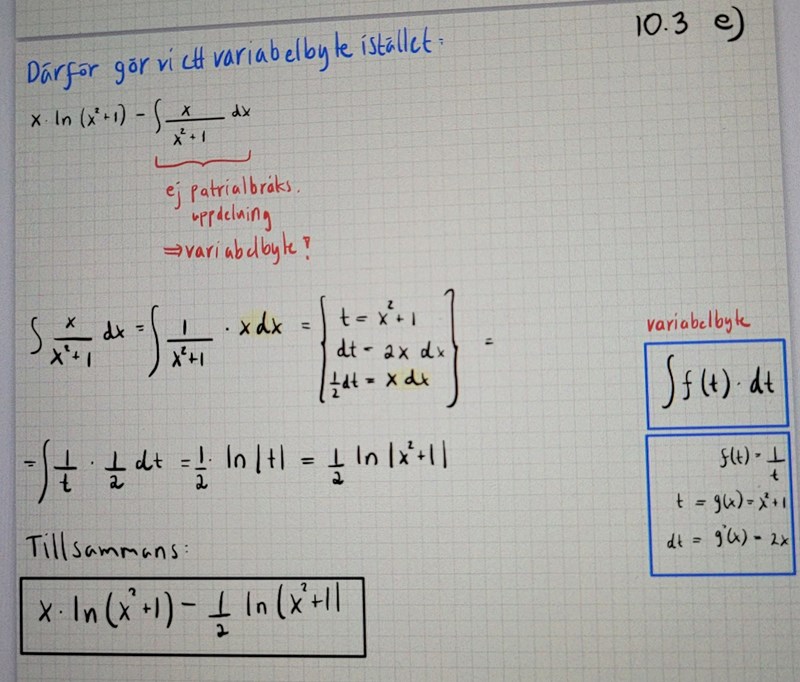 Däremot kan vi känna igen x som nästan derivatan till 1+x2. Det pekar mot att variabelbyte kommer vara smidigt.