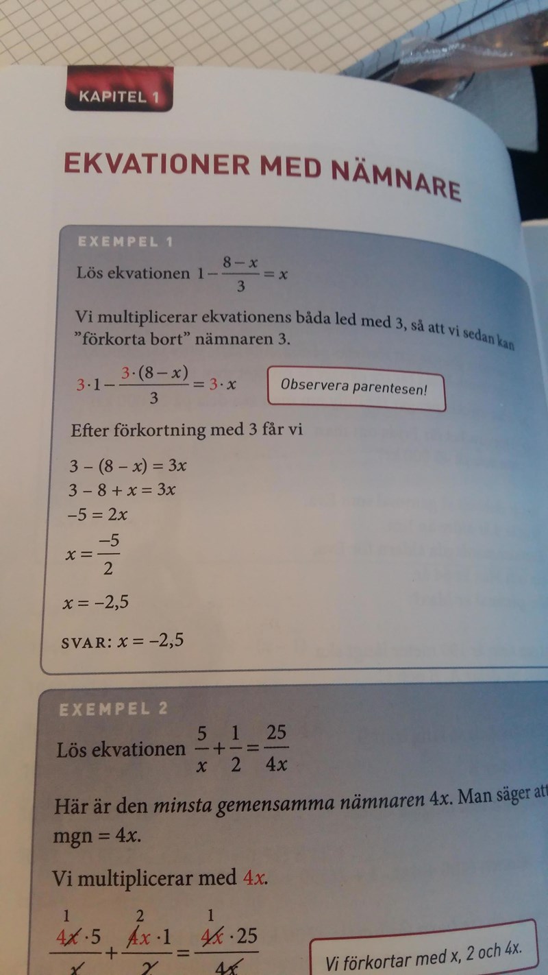 Jag har två frågor här. Varför fungerar inte den första metoden här? Uppgiften är snarlik exemplet (fast endast en förenkling, går ju lätt att dra bort x:et i exemplet i HL och bara förenkla där med utan att räkna ut x). Jag har letat teckenfel och räknat om flera gånger. Jag vet att det ser ut som ett minus framför v/-1 men är bara gammalt kladd. Var gör jag fel? Mina beräkningar och bild ur m2b: