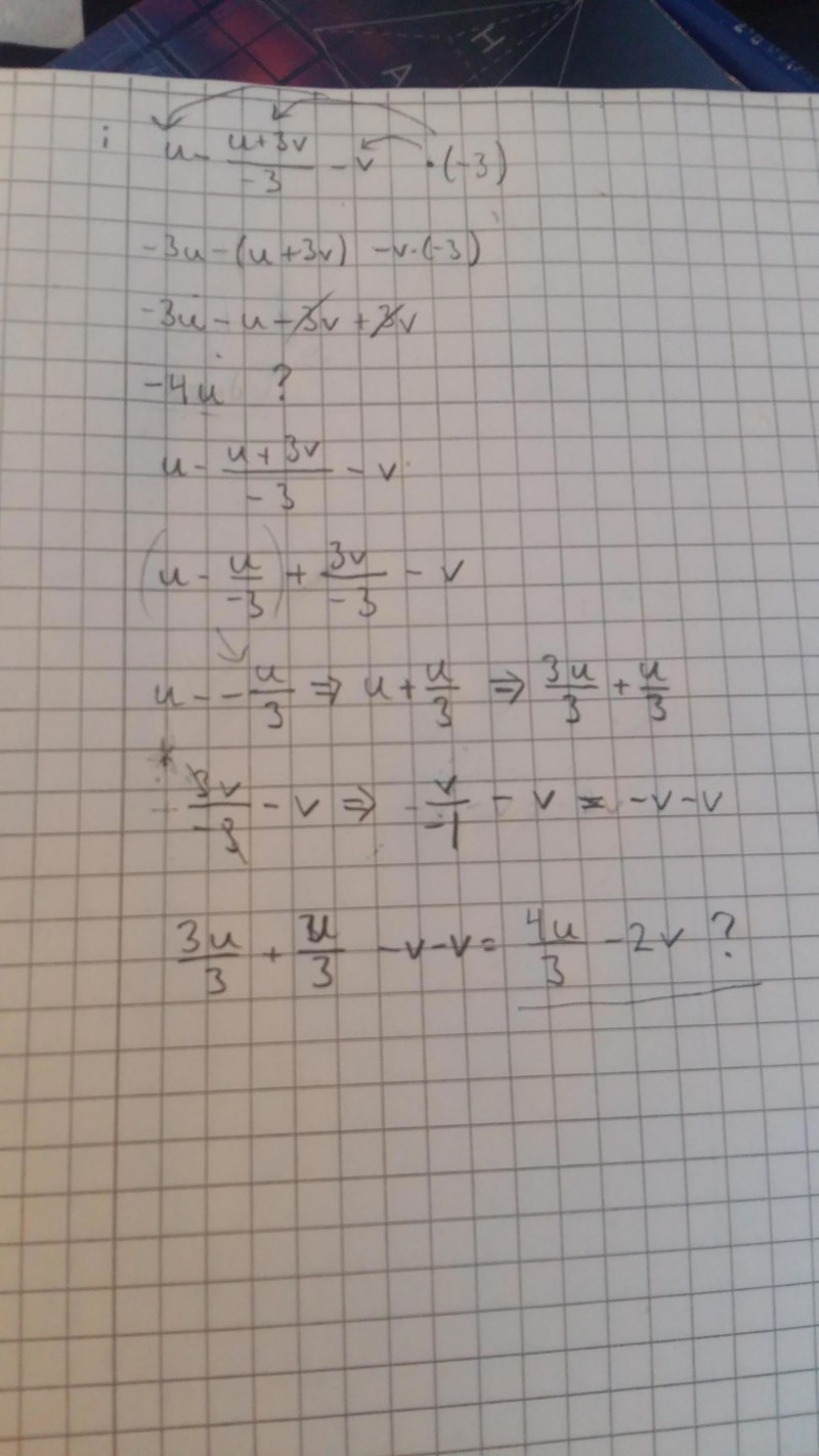 Jag har problem med en förenkling som jag inte får till. Man ska förenkla u - ((u + 3v)/-3) - v, och rätt svar ska bli 4u/3. Först när jag såg uppgifte så tänkte jag att den skulle vara lätt, så jag började med att multiplicera hela ledet med -3 för att bli av med bråket. Svaret som jag får är då -4u vilket inte stämmer. Denna metod lärs ut i matte 2b.