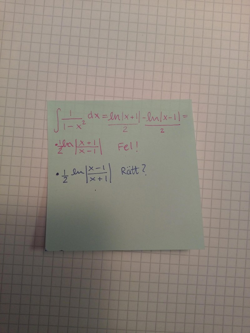 Har stött på ett problem vid flertalet tillfällen. Jag förenklar derivatan av enligt den rosa texten (se bild) vilket jag tycker känns rimligast enligt logaritmlagarna, men varje gång jag gjort det så får jag fel och facit vill att jag egentligen skriver enligt den blåa texten. Är det någon regel eller vad är det jag missat!??!