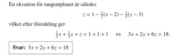 Jag förstår verkligen inte hur man gör förenkling av tangentplanets ekvation, kan tillägga att jag försökt testa mig fram men får inget vidare svar. Kan någon snälla ge en förklaring på hur man gör? Svaret står även ovan.