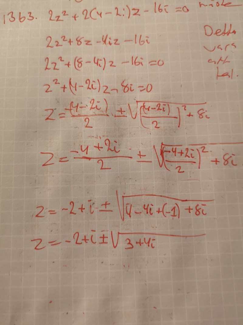 Kan det kanske vara så att jag någon stans i min uträkning gjort fel? För att det känns som att jag inte ska veta hur man ska ta roten ur (3+4i) med det vi lärt oss hittills... Jag kan inte se att jag gjort något fel, men ni kanske ser något som jag inte ser?