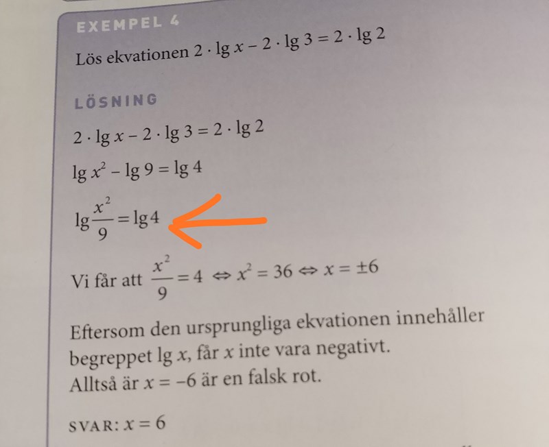 Jag läser om logaritmlagarna och hänger med utan problem tills denna exempeluppgift då man tar bort lg på båda sidor på slutet. Kan någon hjälpa till att peka mig i rätt riktning varför man kan göra såhär?