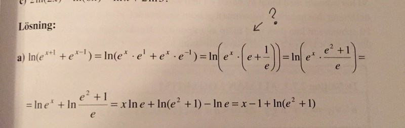 Kan någon va snäll och förklara vad som händer på det tredje steget i ekvationen? Hur kan man få ln(ex *e1+ex *e-1)=ln(ex*(e+1e)), vad är det som händer med e^1?