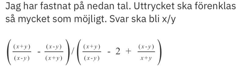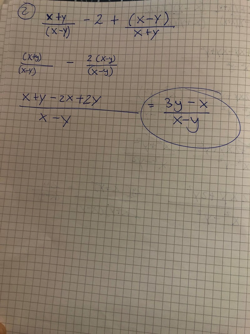När det gäller nämnaren på andra sidan så borde du förlänga första termen med x+y, tvåan med både x+y och x-y pch sista termen med x-y.