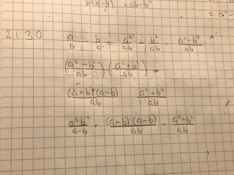Jag föreslår att du skriver ab-ba\frac{a}{b}-\frac{b}{a} på gemensamt bråkstreck, så kan du använda konjugatregeln på täljaren där.