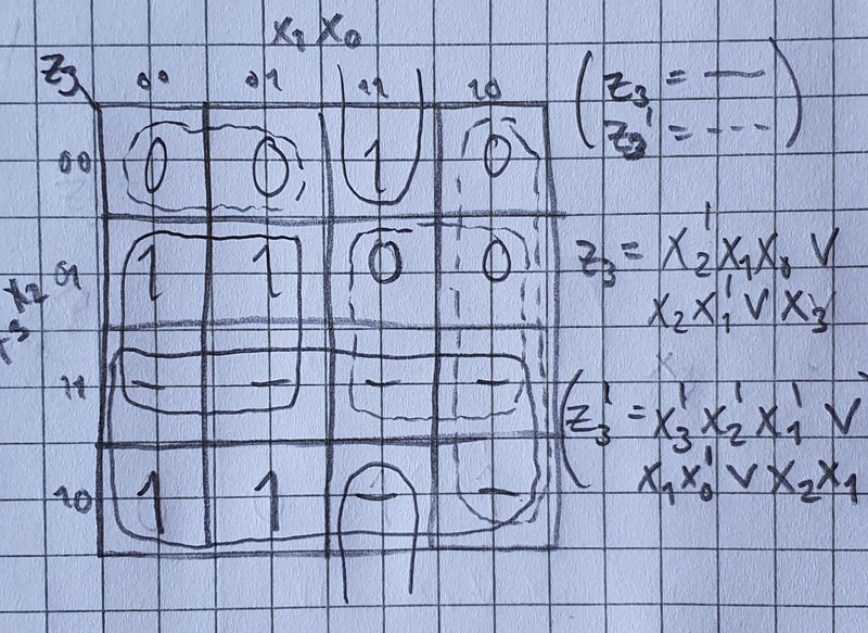 " är decimala siffror 0-9 i BCD-kod. Realisera i en kombinationskrets funktionen där är heltal i vanlig binärkod. Exempel: Om , dvs siffran 7, så skall kretsen ge , dvs talet 21, eftersom . Realisera -funktionerna i minimal NAND-NAND-nät. Insignalernas inverser är tillgängliga."