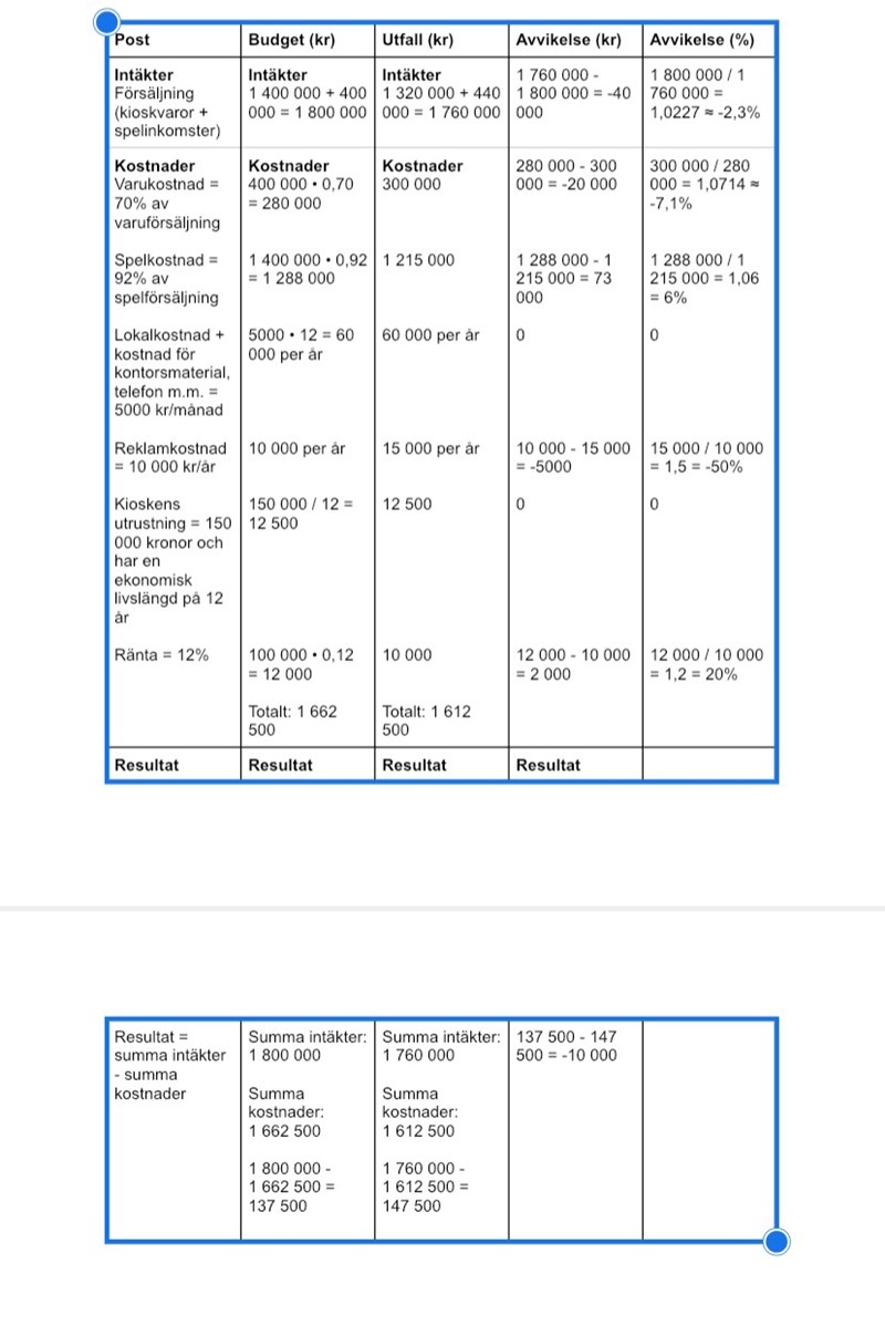 1a) Gör en resultatbudget och en avvikelseanalys för Per kiosk.