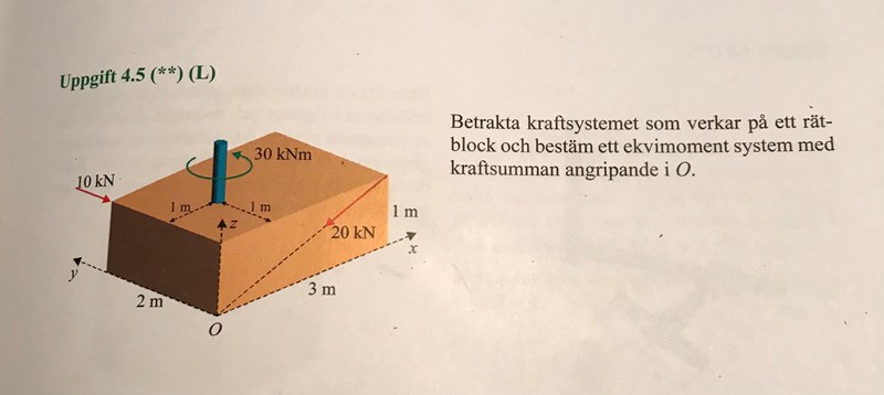 hej! Har ovanstående uppgift. Jag har inte problem med den mer än att jag inte förstår varför jag inte behöver göra någon förflyttning av momentet runt den blå stång till punkten O. Enligt facit kan man bara direkt addera momentet 30kNm till momentsumman i O, medan jag tänker att man bör använda formeln Mo= Ma +Roa X F, där a är punkten för vridmomentet och F är kraftsumman.