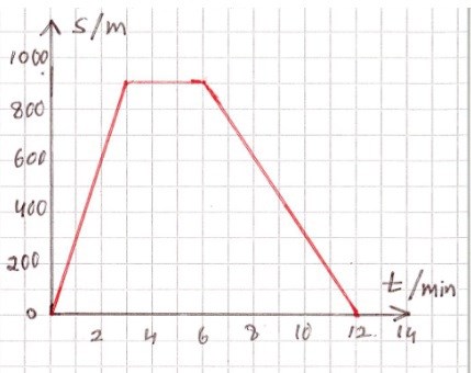 Den tar sig 900 m / 3 min (=300 m/min) och står sedan stilla i 3min till.