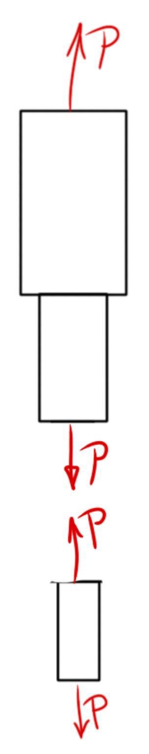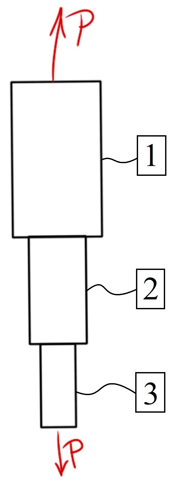 Där jag numrerat stängerna från 1-3. Tänk dig att du gör ett snitt i punkt 3 mellan stång 2 och 3 så att den smalaste stången är nedanför och resten är ovanför. Då vet du med kraftjämvikt att på den nedre stången har du lasten P uppåt i punkt 3 vilket ger att du måste ha lasten P nedåt i punkt 3 på resten ovanför.