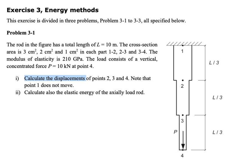 Hej! Om jag har en stång som sitter fast (orörlig) i en punkt och har olika tvärsnittsareor och last som verkar i en av punkterna. Hur beräknar jag förflyttningen i respektive punkt? Jag tänkte använda mig av formeln PL/EA där P=lasten i punkten L=längden av stången mellan två punkter E=emodul och A=tvärsnittsarean
