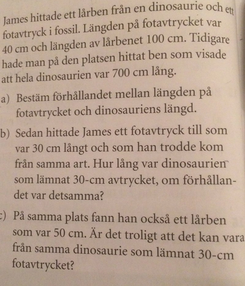 b) Här gäller det att tolka texten och förstå vad du gjorde i uppgift a). Du vet att förhållandet mellan avtryck och längden är 2/35 (alltså för varje 2 cm fotavtryck är han 35 cm lång) du får också veta att förhållandet i dinosaurie b är samma som den i a.