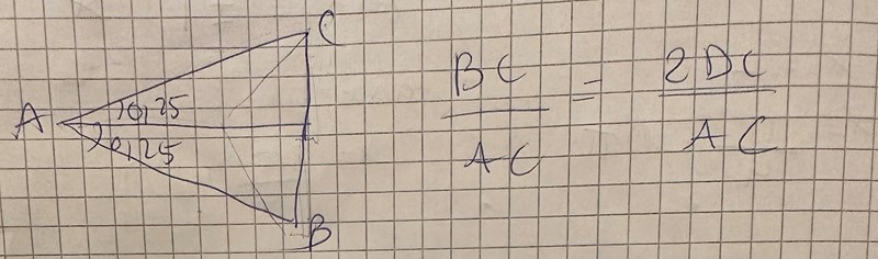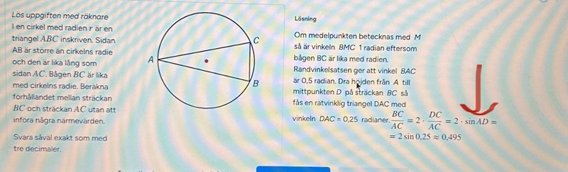 Värdet av sin(0,25 radianer) är lika med motstående sida dividerat med hypotenusan (dvs. DC/AC). Eftersom vi letar efter , och , och vi inte vet längden av sidorna, är sin(AD) ett bra sätt att hitta . :)