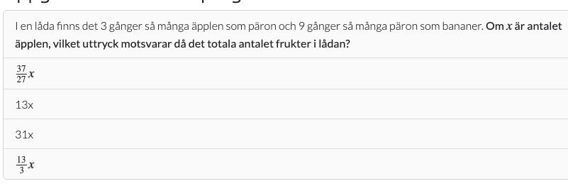 du hade 1 : 9 : 27 där 1 är bananer, 9 är päron och 27 är äpplen.