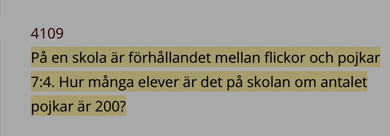 Jag trot att man ska förlänga antalet pojkar till det blir 200, alltså 200/4= 150. Sedan tror jag att man ska multiplicera 7 med 150, men svaret kommer inte att bli rimligt