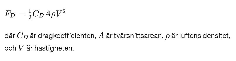 Dragkraften F för ett föremål som rör sig genom luft kan beräknas med formeln för aerodynamiskt motstånd: