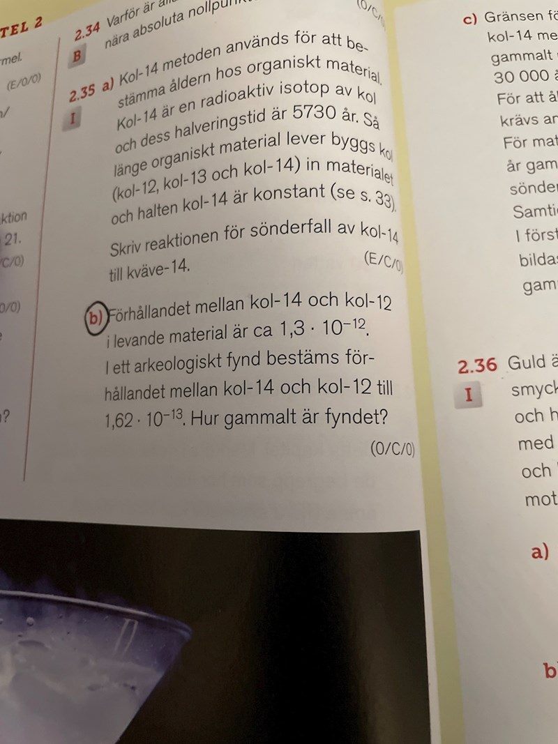 Skulle materialet vara levande, skulle fördelningen vara precis som är beskrivet "för levande material" i uppgiften. Kol-14 sönderfaller med halveringstiden som står med i a-uppgiften, och i samband med sönderfallet förändras förhållandet mellan kol-14 och kol-12, andelen kol-14 minskar med andra ord. Därför är förhållandet lägre i det arkeologiska fyndet.