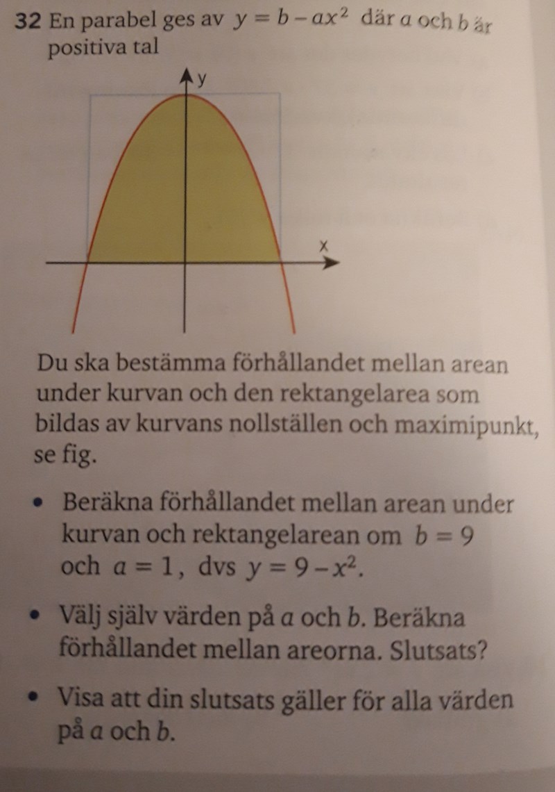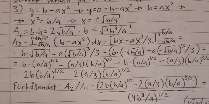 I sista punkten på följande uppgift ska man visa att förhållandet 2/3 gäller för alla värden på a och b. Men jag får förhållandet till 8/9. Bild på uppgiften (sista punkten) och bild på min lösning visas nedanför.
