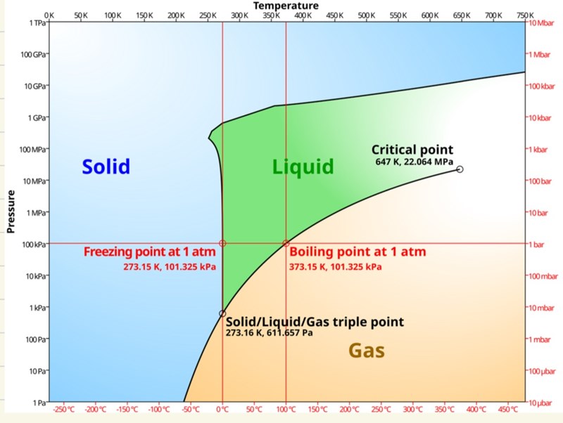 Förstår att punkten ”triple point” är där alla tre faser kan existera samtidigt. Och att både tryck och värme påverkar de olika fasövergångarna. Vet ej vad atm är för enhet eller kPa eller mbar.