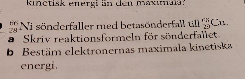 Det jag gjorde va att skriva upp reaktions formeln, subtrahera bort elektron massan för kärnorna, sedan ta diffrensen på vikten före och efter, där jag även tar med elektronen som koma av B- strålning. Sedangör jag om delta vikt till enrgi. Sedan så är den maximala energin på elektronen, om den fick 100% av energin, och antineutrinen 0%. Men facit använder andra värde siffror och kan ej tolka om jag har gjort rätt, så lös uppgiften steg för steg åt mig, eller säg till om min metod är fel.