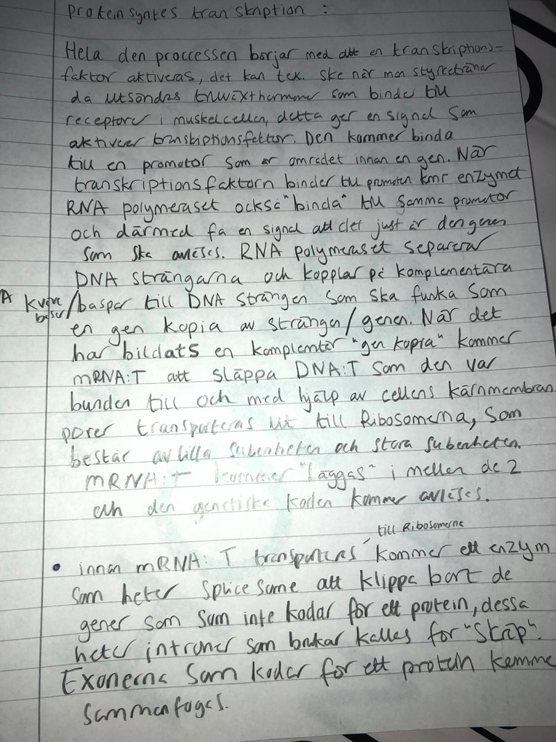 Så här har jag definierat/ förklarat transkriptionen i proteinsyntesen. Undrar om jag kan förbättra något/ ändra?