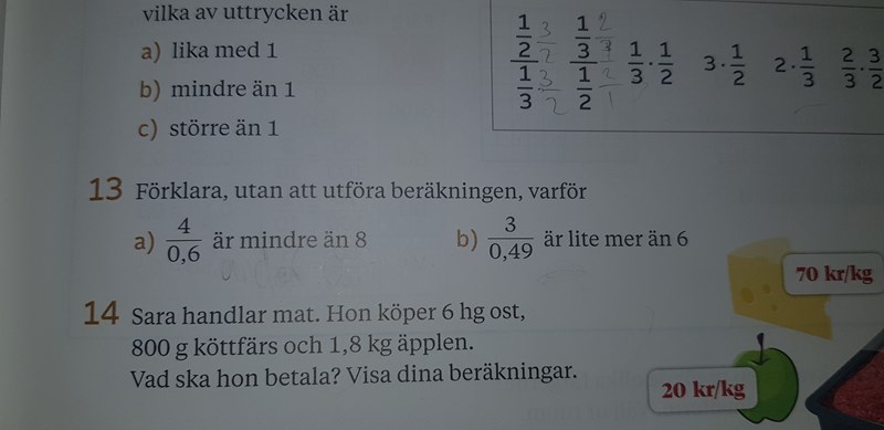 Jag behöver hjälp med fråga 13. Jag vet att svaret alltid blir mindre om det är mindre än en hel. Men jag vet inte hur jag ska förklara mig, speciellt inte på b). Jag har prov imorgon och liknande frågor kommer komma så jag behöver veta hur jag ska motivera mig.