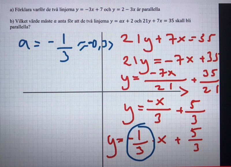 Förklara varför de två linjerna y=-3x+7 och y=2-3x är parallella!!