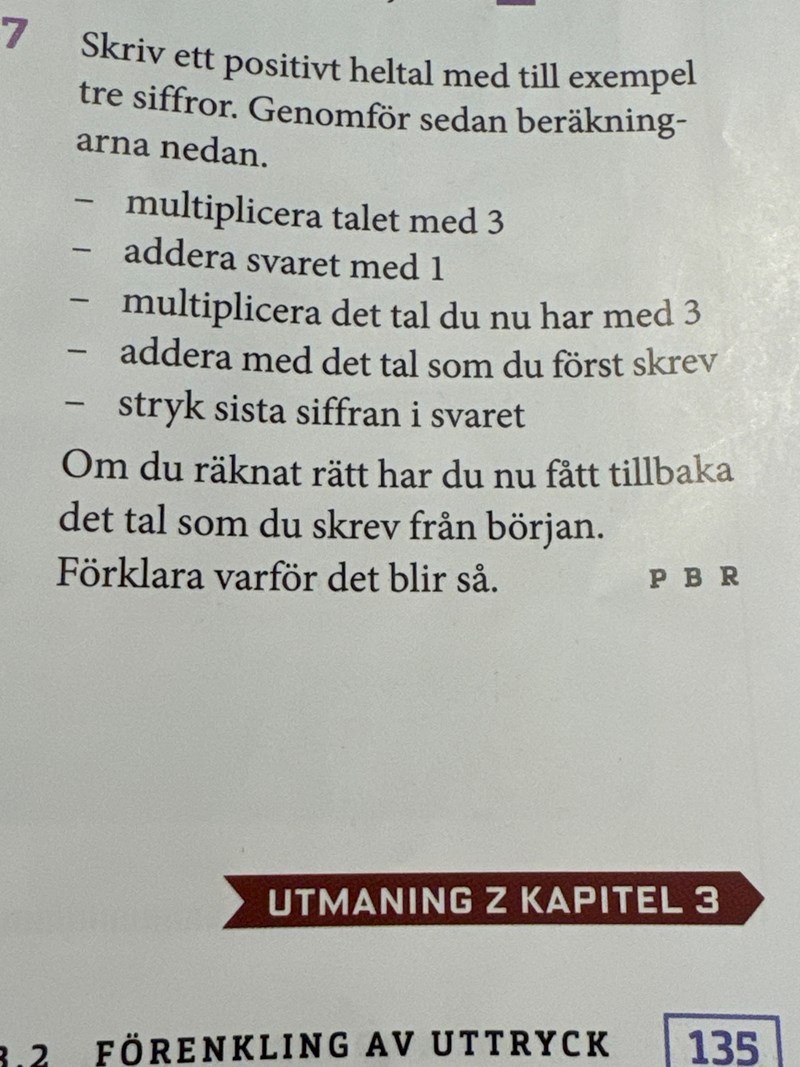 det ger oss 10x+3 innan det sista steget. Där är 3 entalet och när man tar bort det blir tiotalet entalet osv vilket ger oss samma tal som i början.