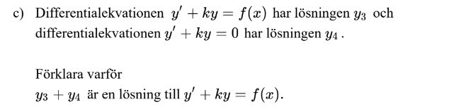 y' + ky =f(x)(y3+y4)' + k(y3+y4) =y3'+y4'+ky3+ky4 =y3'+ky3+y4'+ky4=f(x) + 0 =f(x)Där vi använt oss av att y3'+ky3 =f(x)och y4'+ky4 =0.