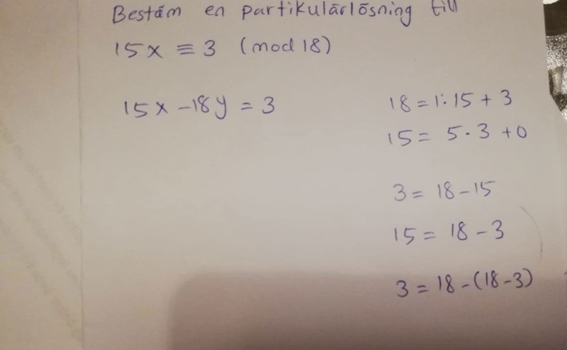 Lös ekvationen 15x ≡ 3 (mod 9).