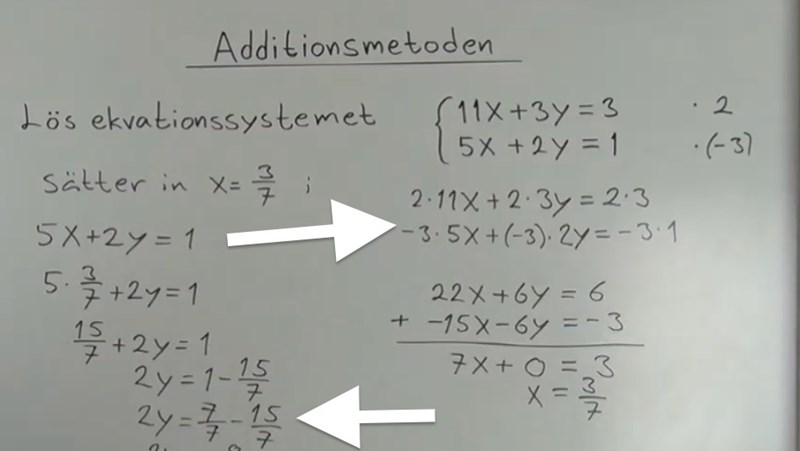 Jag har gjort två pilar i bilden ovan som visar vad min fråga handlar om. Detta är alltså ett exempel på additionsmetoden, men min fråga handlar om förlängning/förkortning av tal i ekvationer.