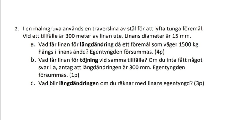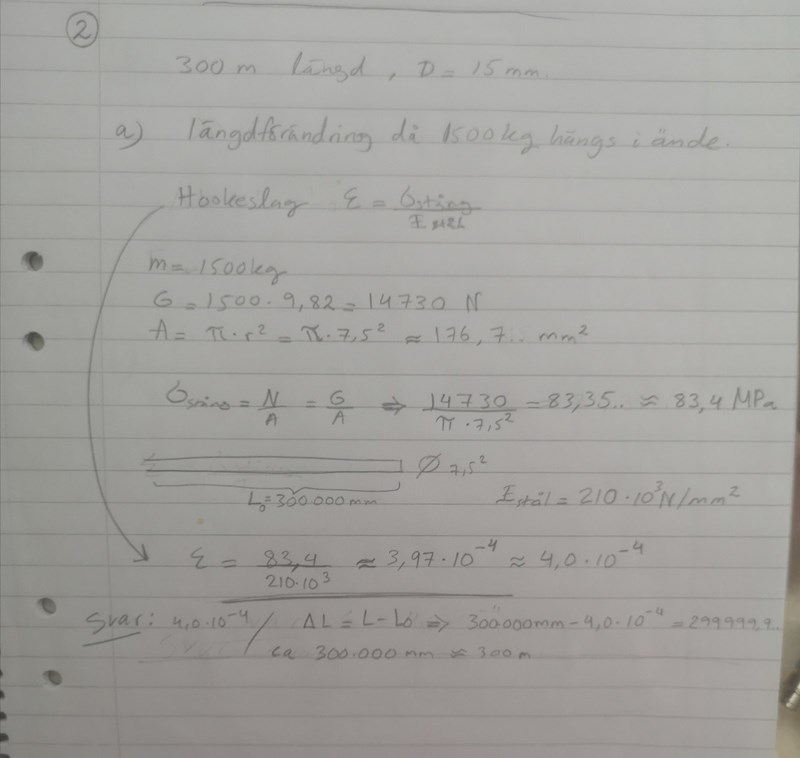 Det ser väl rimligt ut fram till och med beräkning av töjningen (har inte kontrollräknat) men sen ska du räkna ut längdförändringen och den definieras som