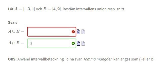 OBS: Använd intervallbeteckning i dina svar. Tomma mängden kan anges som {} eller Ø.