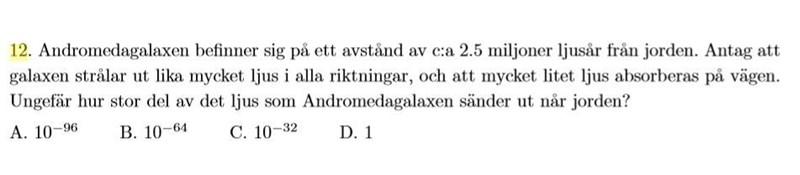 Notera att det är viktigt att kunna göra den här sorters storleksuppskattning som jag gjorde ovan utan miniräknare. Det gör ingenting heller om du skulle råka hamna en eller två tiopotenser fel, det hade fortfarande varit tillräckligt för att se vad det rätta svaret skulle vara.