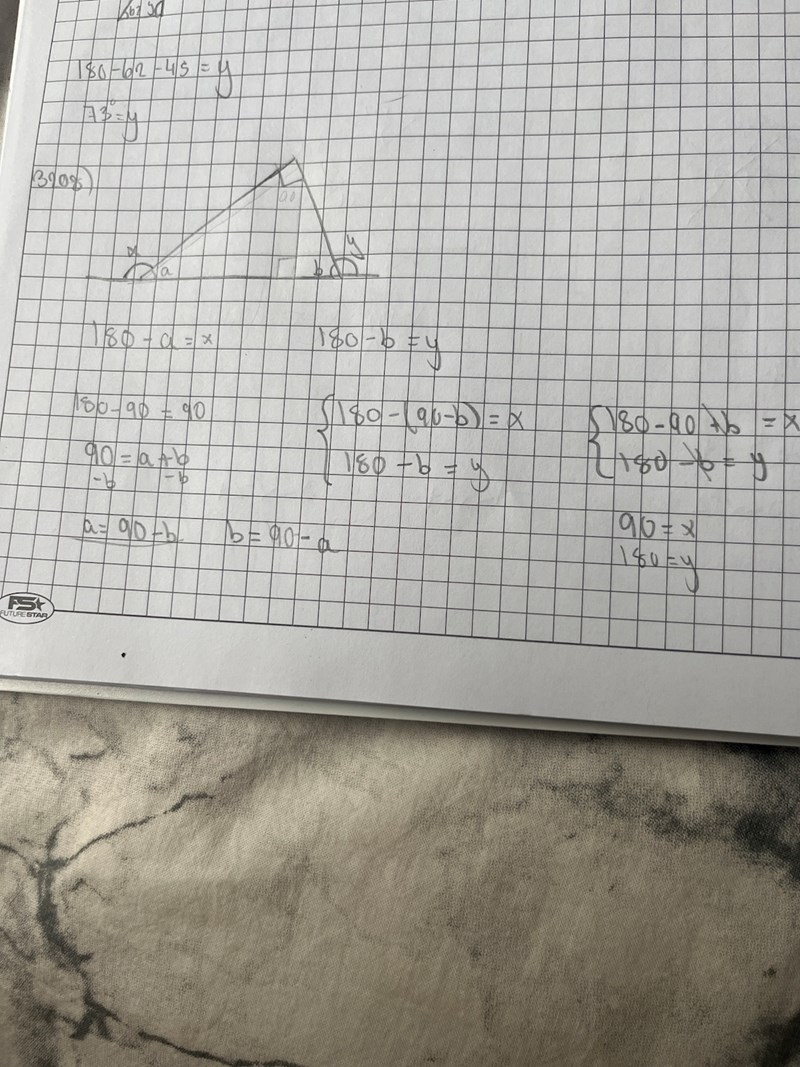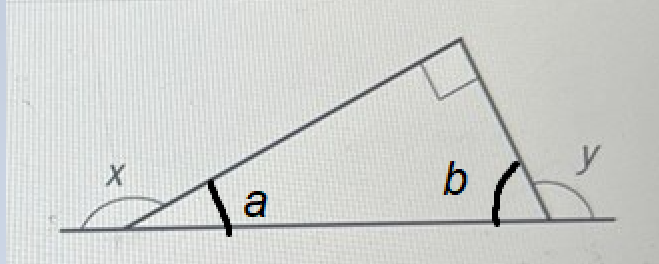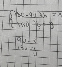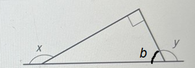 90°+b=xy+b=180°\left\{\begin{array}{l}90^\circ+b=x\\y+b=180^\circ\end{array}\right.
