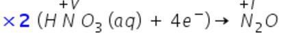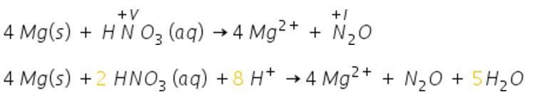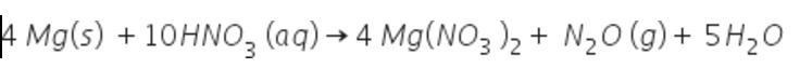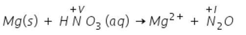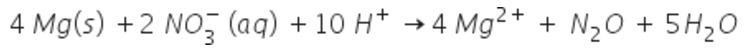 ''Skriv formel för upplösning a magnesium i utspädd salpetersyra. Här reduceras nitratjonerna till dikväveoxid.''