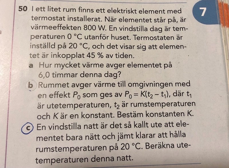 Jag fastnar på fråga c). Formeln som är given i b) använder jag för att lösa uppgift b) och får rätt svar då jag utnyttjar att elementet bara är inkopplat 45% av tiden, dvs P0 = 800W * 0,45. Min fråga är varför jag i uppgift c) inte tar hänsyn till att elementet är inkopplat 45% av tiden utan istället enligt facit bör räkna med att P0 = 800W?