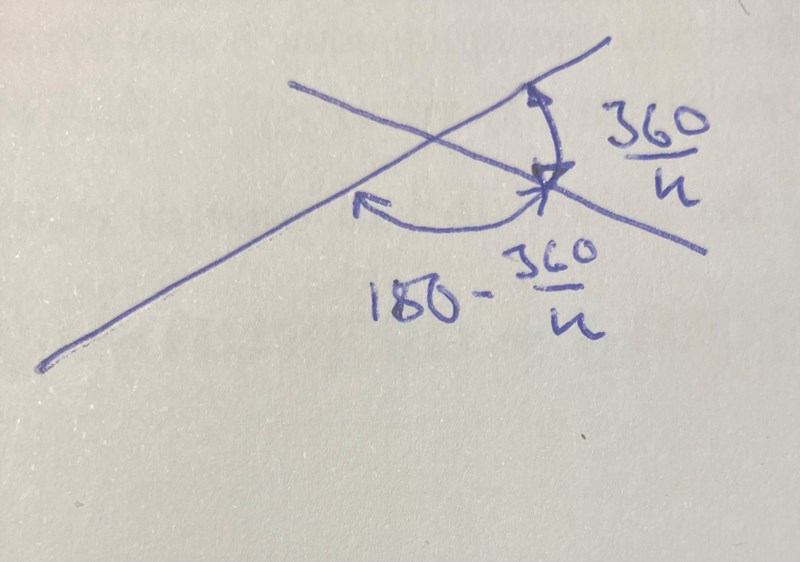 Sen blir vinkeln i n-hörningen 180-360/n eller 180(1-2/n)