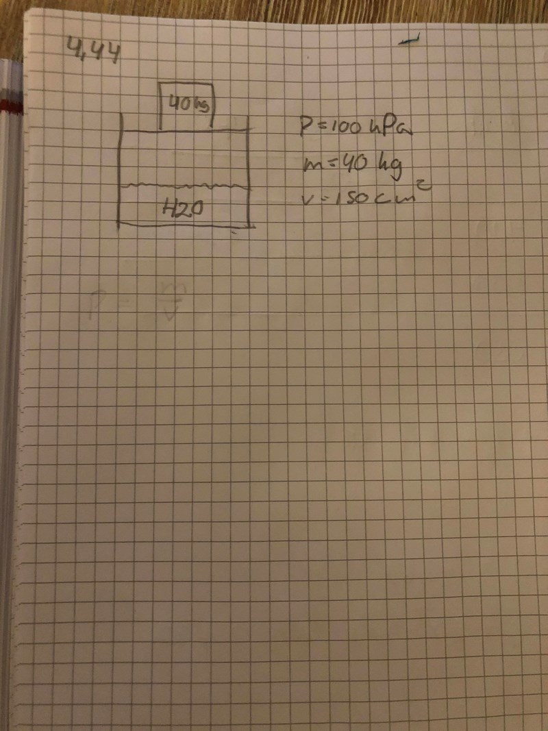 Uppgiften: En vertikal piston-cylinder har en massa på 40kg och en tvärsnittsarea på 150cm2 . Den lokala trycket är 100kPa (atm).