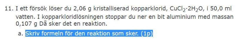 Korrekt svar: 3CuCl2 + 2Al ---> 3Cu + 2AlCl3