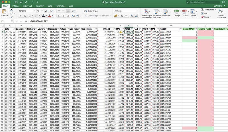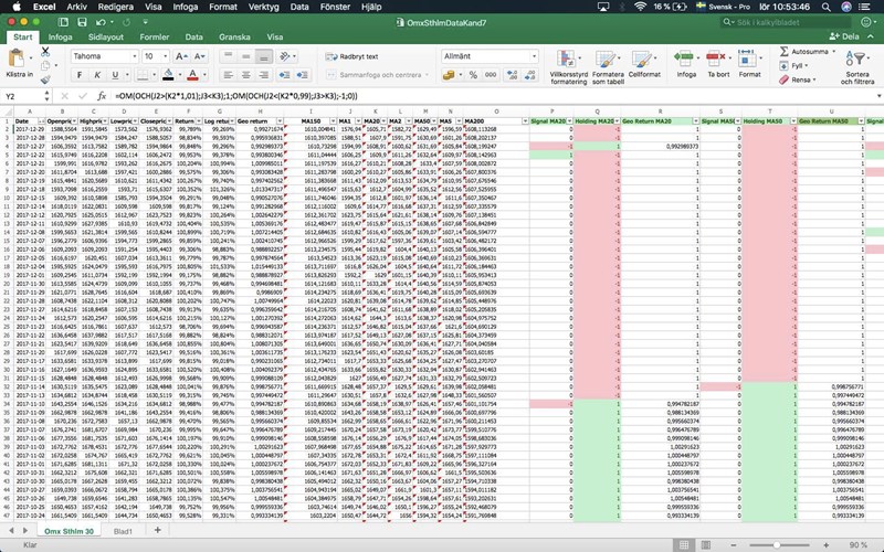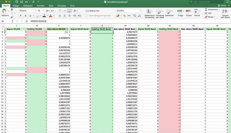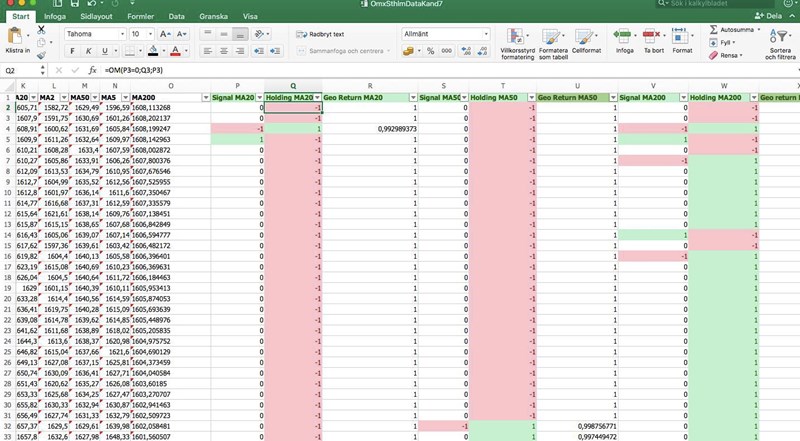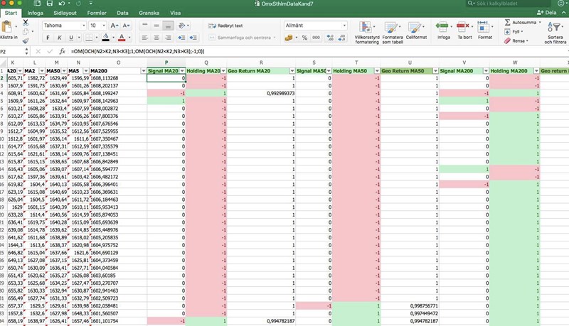 Ska kanske även förtydliga att jag inte vill ha köp-köp eller sälj-sälj utan när sälj gjort till exempel, då ska vi ligga utanför marknaden tills en köpsignal kommer. Vi blankar inte eller något liknande. Samma med köp, kommer en köpsignal så ska vi ligga i marknaden tills sälj = investerar/säljer alltid hela kapitalet. Vi köper alltså inte för varje dag femdagars medelvärde är över tjugodagars utan bara i samband med att dom korsar. Det framgår i formeln, men tänkte ändå att det kunde vara bra med ett extra förtydligande där.