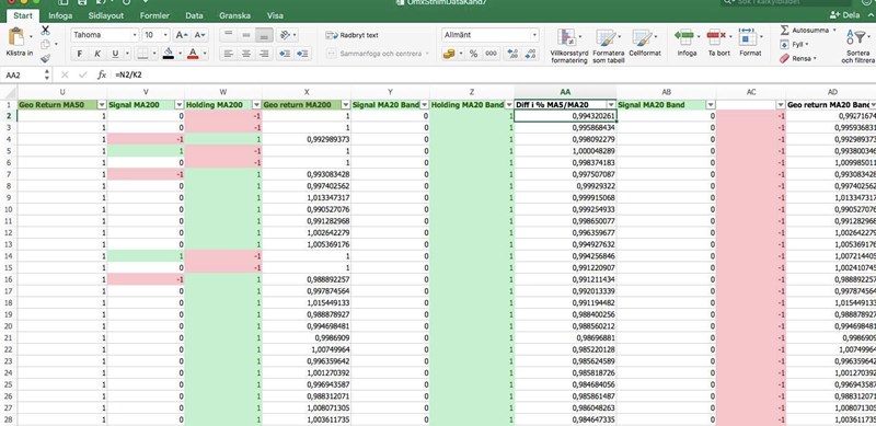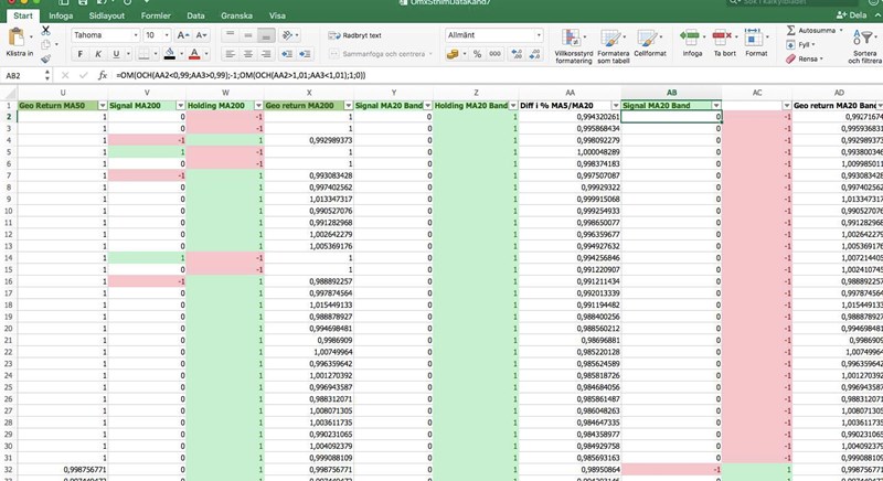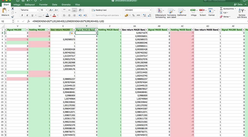Som ni ser i bilderna nedan, så sker endast signaler(1 och -1) när en korsning med över en procent sker direkt. Så sker en korsning med exemplevis 0,5% för att dagen efter sked med ytterligare 1% så genereras ingen etta i kolumnen för signal, vilket i sin tur påverkar kolumnen för holding. Det vill jag att det ska göra. Exempelvis, om N5<K5 och sen N4>(K4*1,005) och sen N3>(K3>1,01), då får jag ingen köpsignal med den formel jag skrivit in. Men det vill jag, aggregat så har det ju överstigit 1%.