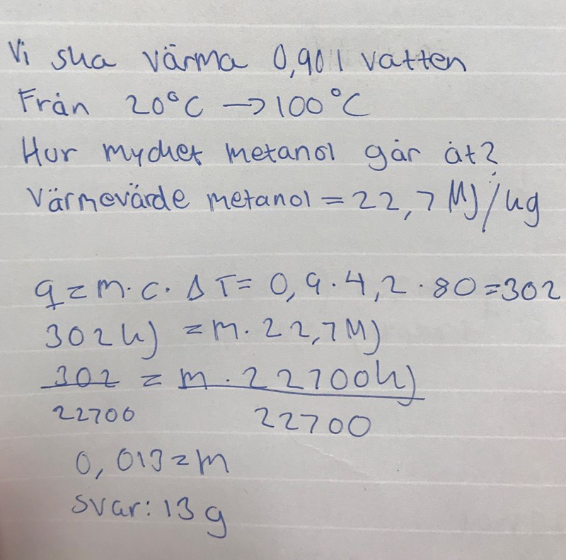 I detta fall undrar vi ju energin som går åt för att förändra temperaturen hos vatten med . Sedan undrar vi även hur mycket metanol vi behöver förbrännas för att få denna energi, men för att räkna ut det använder vi inte formeln .