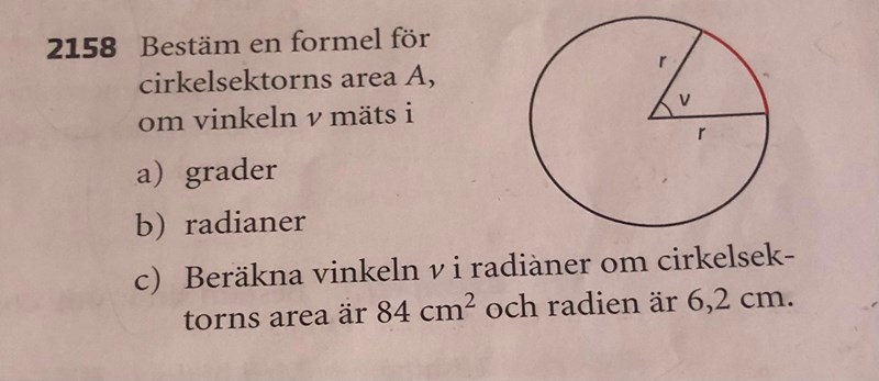 Jag har tre formler jag känner till så jag tänkte att man kunde använda sig av cirkelsektorns area: A= (v•r^2)/2