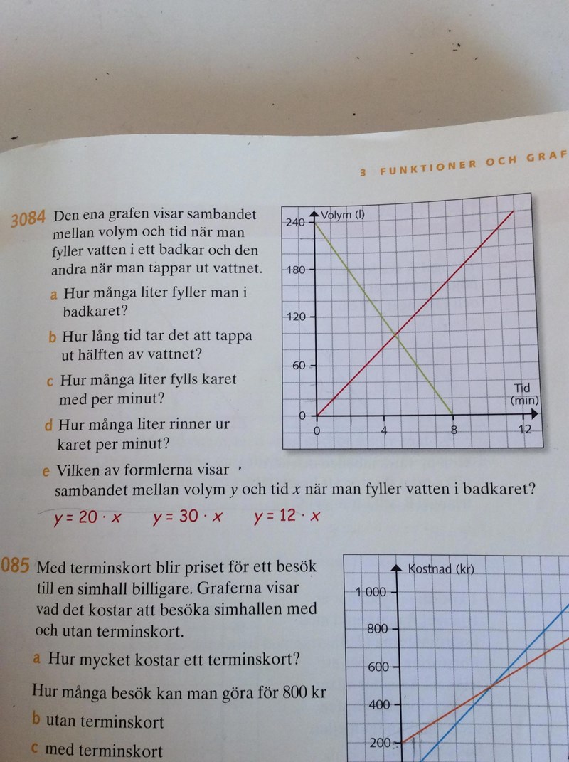 Ja, det har med den räta linjens ekvation att göra (y=kx+m) och svaret på denna uppgift borde bli y=20 * x (eller y=20x) eftersom det är den röda grafen som beskriver förhållandet mellan hur mycket vatten som fylls per minut. Anledningen till att m-värdet inte finns med är för att det är en proportionell linje (alltså går genom 0). Så för att komma fram till svaret så måste man först välja ut en punkt i koordinatsystemet, t.ex. (4, 80) och genom att dividera 80 med 4 så får man ut hur många liter som fylls per minut, alltså 20 l/min och därför blir y=20x. Eller annars kan man bara titta hur många liter som fylls på en minut och det blir ju 20 (om man tittar på hörnet på första rutan längst ner till vänster) Hoppas detta var till hjälp och att du förstår