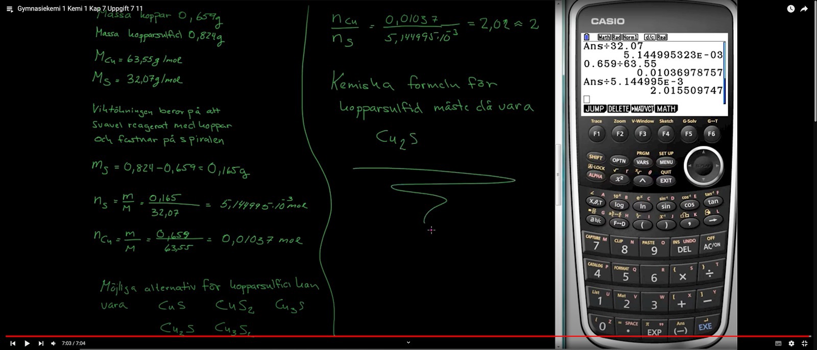 Man låter en kopparspiral som väger 0,659g reagera med svavelångor. Då bildas kopparsulfid. När spiralen vägs efter upphettningen har den massan 0,824g. Beräkna föreningens formel.