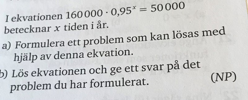 Gör nu ett nytt försök att lösa ut 0,95x ur ekvationen 160 000•0.95x = 50 000