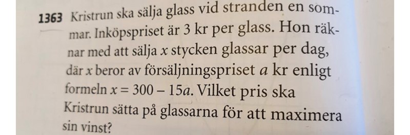 ax där a är försäljningspriset och x är antal glassar hon säljer. Det blir a(300-15a) = 300a-15a^2