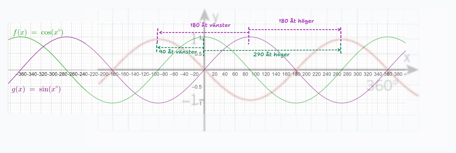 I och med att vi har funktionen y=sin(x+180) i bilden, måste inte y=cosx förskjutas 90 grader åt HÖGER för att vi ska få tillbaka våran sinusfunktion?